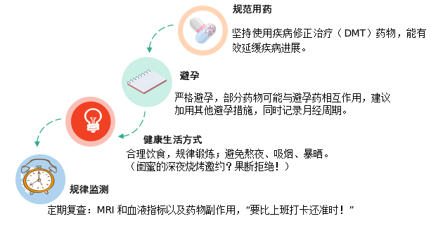 药物调整:疾病稳定至少1年,停用有风险的DMT药物(如:特立氟胺、S1P受体调节剂等),调整为安全用药,具体药物选择请咨询医生。