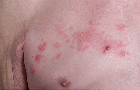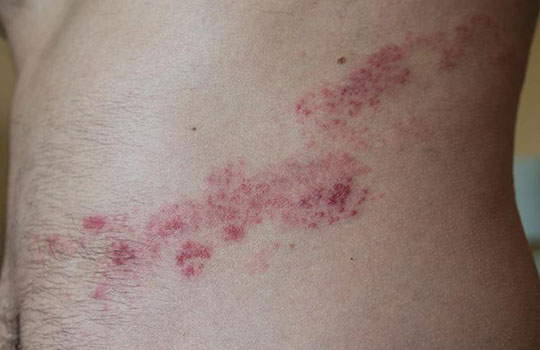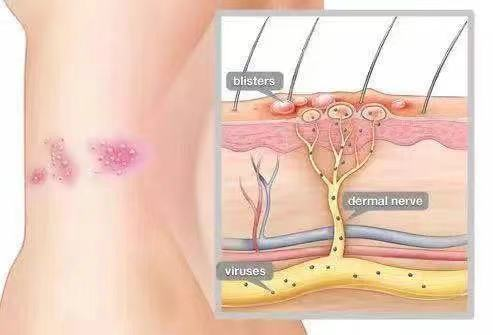临床上最常见的表现就是:在皮肤某一部位出现单侧分布带状排列的成簇的丘疹、丘疱疹或水疱,基底潮红,很多病人可伴随不同程度的神经痛。